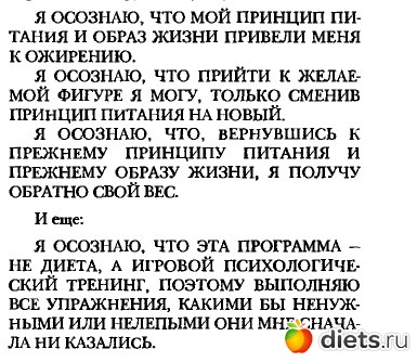 и еще Я ОСОЗНАЮ, что эта программа не диета, а игровой психологический тренинг, поэтому я выполняю все упражнения, какими бы ненужными или нелепыми они мне не казались.