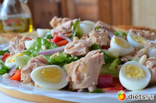 Консервированного тунца разминаем вилкой, добавляем в салат (без жидкости).
