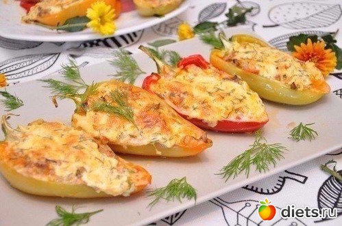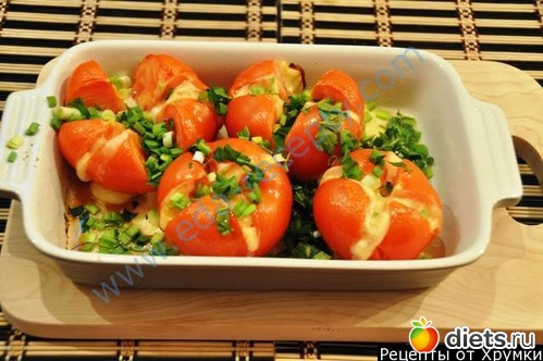 Моем помидоры, лучше среднего размера и по возможности одинаковые. Со стороны плодоножки острым ножом делаем разрез крест на крест. Копченый сыр режем тонкими ломтиками и вкладываем эти ломтики в разрезы. Чуть посыпаем красным перцем, солим и сбрызгиваем маслом. Запекаем фаршированные помидоры в духовке или на гриле пока сыр не зарумянится. Подавать на стол теплыми, посыпанными зеленью.
