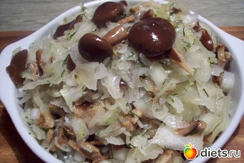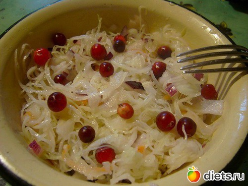 Есть еще варианты-квашенная капуста с маринованным огурчиком,луком репчатым и зеленым горошком, а заправка масло растительное.Можно приготовить капусту просто с брусникой.