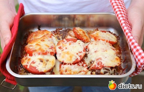 Помидоры нарезать кружочками и выложить сверху. Посолить, поперчить и посыпать тертой моцареллой.