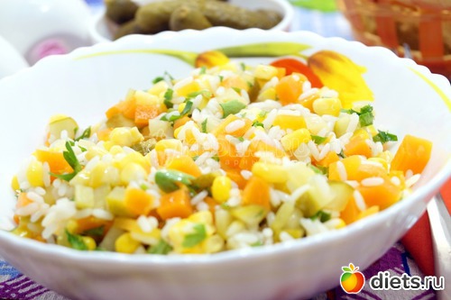 Наш вкусный салат с рисом готов. Можно подавать к столу.