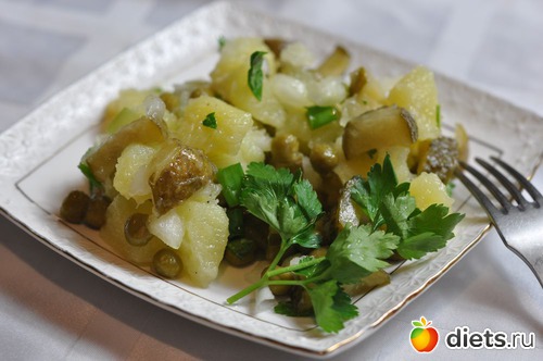 Салат с зелёным горошком и картофелем готов. Можно подавать к столу.