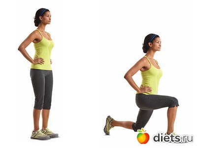 При выполнении упражнения держите спину прямо. Руки держите на поясе. Не допускайте, что бы коленка заходила за носок. Идеально, что бы она находилась на одной линии с голенью.