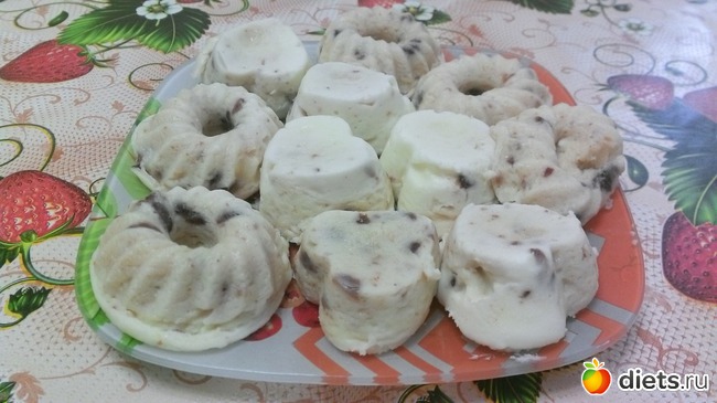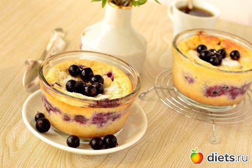 В другую ягоды (можно добавлять изюм, курагу, орешки). Разложить по баночкам, оставив немного места, так как запеканка будет увеличиваться в размере, запекать 5-7 мин 600Вт, в зависимости от величины формы.