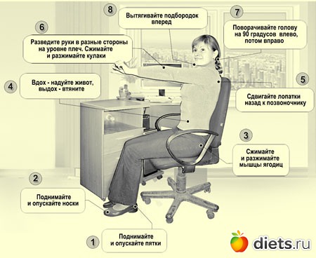Упражнений всего-то восемь, но делать их нужно с максимальным напряжением мышц. Все восемь упражнений пошагово изображены на инфографике.Если практиковать их каждый час, то растратишь до 15% килокалорий. Замечание тем, кто хочет «незаметно» худеть.