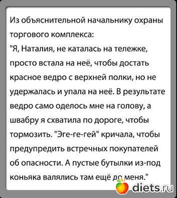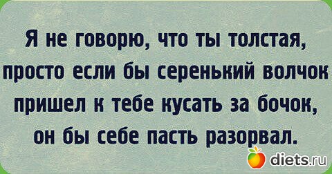 20.07.2008. «Мой муж сошёл с ума. Он решил заняться моей фигурой сам. Мотивирует это тем, что это надо мне для счастья и уверенности в себе. А говорил, ему всё равно! Подлый лгун!!! Предложил мне заняться спортом. Сам понял, что сказал? Каким спортом? Я и спорт несовместимы! Лучше буду такая, какая есть. Толстых тоже любят, я читала!»