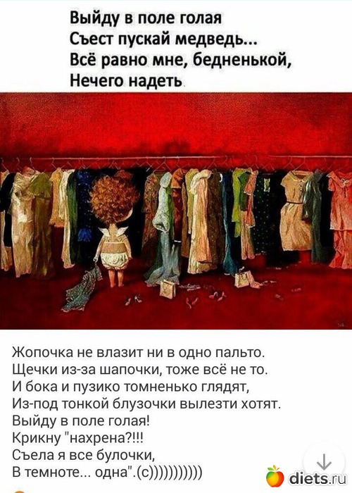 P.S.Можете смеяться --это про меня.Правда в другую сторону.Объемы упали,размеры уменьшились.Отослала более 20 кг вещей,2 мешка раздала,остальное в Красный Крест.Открываю шкаф --все еще полный и одеть нечего .Сегодня пошла в жилище дочери и рылась в ее шкафу -- погорячилась --мне до ее размера еще попахапть надо.Короче ,я сейчас в между размерами.Конечно ,блузки можно таскать и размером побольше,но все тренеровочные штанцы соскальзывают и силиконовые полоски покупала -- ушить невозможно,а новые купить жаба душит --надо подобрать и цены кусаются --только что в конце августа купила и вот снова надо выискивать.Придется сбрасывать дальше --тогда с дочкой у нас куча одежды.