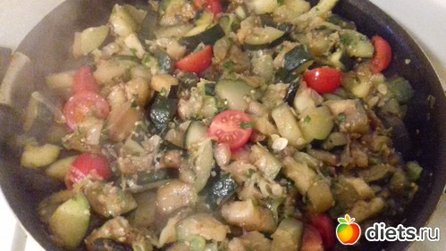 Состав: цукини, баклажан, лук порей, помидорки черри, петрухан, немного чесночка, соль перец по вкусу