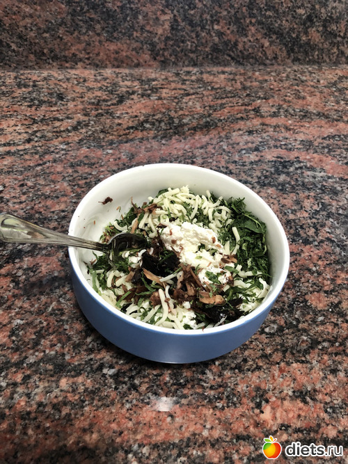 - [ ] Смешать ножки грибов, сыр, творог и петрушку