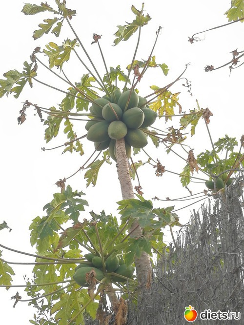 А это растет папайя у кого-то,3 дерева,усыпанные плодами.Штук по 15 на каждом!Надо сказать,что эти плоды не распространены в кулинарии региона,и недооценены.А тут живет,наверное,их большой ценитель.Ибо эти растения-совершенно не характерны для данной местности.