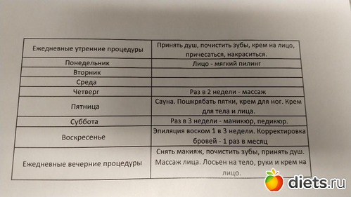 Красота-стандартный набор:голова через день,тогда же скраб и крем для тела. Ежедневно утром и вечером крем на лицо и веки,крем для рук стоит везде ,есть раковина и на полочке в коридоре. Маски ооочень редкий гость-этож надо полежать спокойно,а для меня это хуже не придумаешь)) Короче ,здесь есть над чем работать
