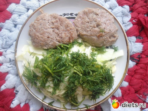 Мои ужины пока однообразны. Это куриные котлеты домашние, жареные на сухой сковороде без масла в собственном соку, так сказать, и салат из капусты, лука-репки и укропа с лимонным соком