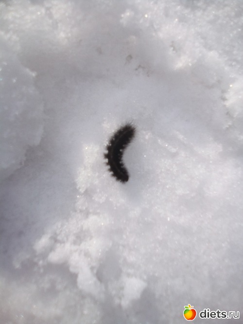 Случайно в снегу увидели гусеницу, ползла!!! Потом скрутилась в клубочек. ребенок посадил ее на елку.