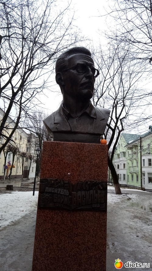 А это бюст писателя Бориса Васильевна с моей мандаринкой. На этом прогулку завершила. Я каждый день хожу на работу и с работы 4500-5000 шагов.