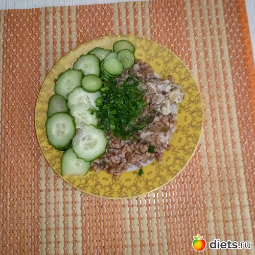 Гречка с фаршем и огурцом и любимый салат из сыра и черешка сельдерея