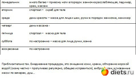 Каждый день – обливание, крем для тела/лица/рук, спорт, дневник питания.