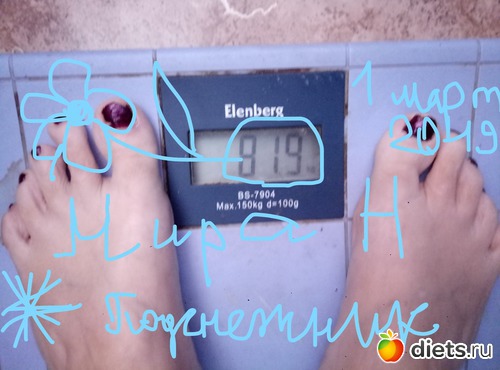 Главная цель - терять по 0,5 кг в неделю. А значит должно уйти не менее 6кг. 97,4-6= 91,4кг. Но я очень хочу увидеть восьмерку к концу марафона. Поэтому пусть цель будет не менее 89,9кг.