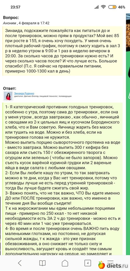 Посмотрела вопросы - ответы, нашла полезную информацию, обязательно буду использовать советы по питанию до тренировок. Иногда голодная ходила с утра, теперь буду обязательно завтракать.