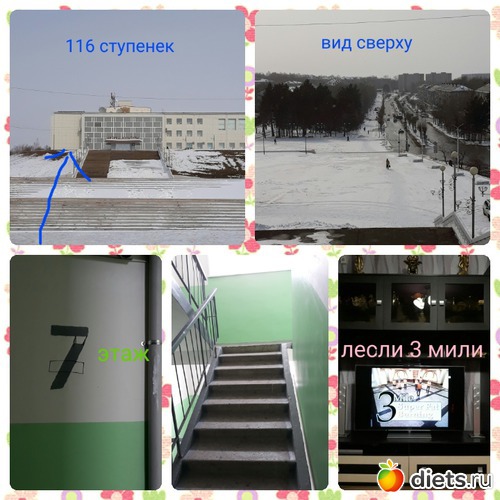 Спорт: у меня 3,5 этажа это 60 ступенек. Из них 3×60 я поднялась подтягивая колени к груди. Остольные 2 раза простой подъем.