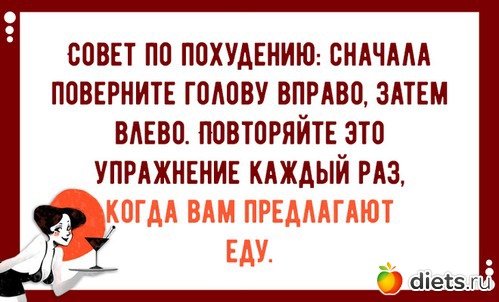 - Скажите, доктор, какие упражнения полезны для похудения? - Я рекомендую Вам поворачивать голову справа налево и слева направо ответил доктор. - Как часто? - Всякий раз, когда Вас угощают!