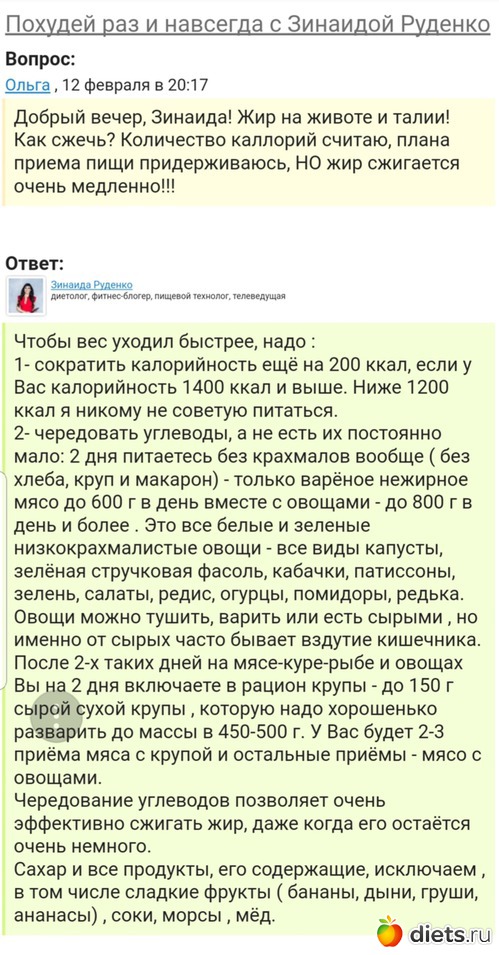Питание.... извините меня, но диетолог который сажает на 1200 кал.... исключает крахмальные овощи ит.д.... не мое... Кто нибудь поинтересовплся дипломом? Я вот училась в физкультурном- но это не значит, что я тренер...