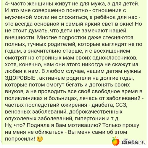4- часто женщины живут не для мужа, а для детей. И это мне совершенно понятно - отношения с мужчиной могли не сложиться, а ребёнок для нас - это всегда основной и самый яркий свет в окне! Но не стоит думать, что дети не замечают нашей внешности. Многие подростки даже стесняются полных, тучных родителей, которые выглядят не по годам, а значительно старше, и с восхищением смотрят на стройных мам своих одноклассников, хотя, конечно, нам они этого никогда не скажут из любви к нам. В любом случае, нашим детям нужны ЗДОРОВЫЕ , активные родители на долгие годы, которые потом смогут бегать и догонять своих внуков, а не проводить все своё свободное время в поликлиниках и больницах, лечась от заболеваний -частых последствий ожирения - диабета, ССЗ, венозных заболеваний, доброкачественных опухолевых заболеваний, гипертонии и т д.