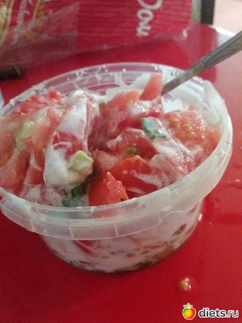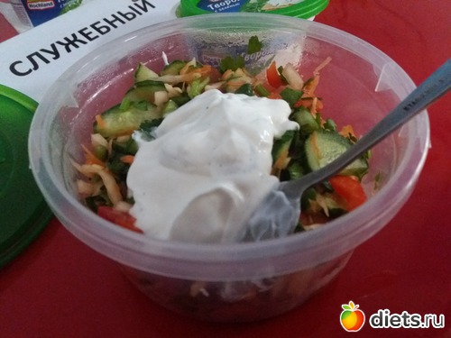 капуста.морковь,огурец,помидор,перец,зелень,сметана 10%(первый и последний)