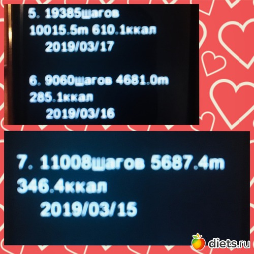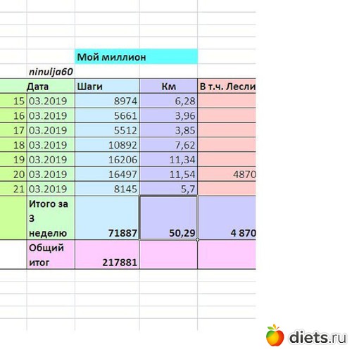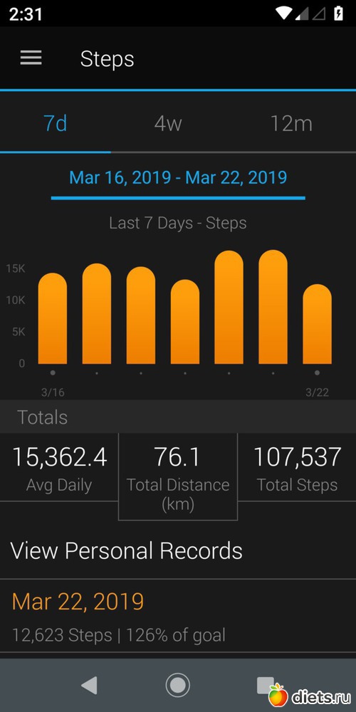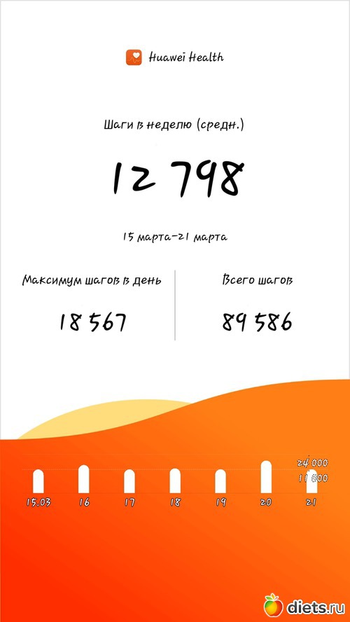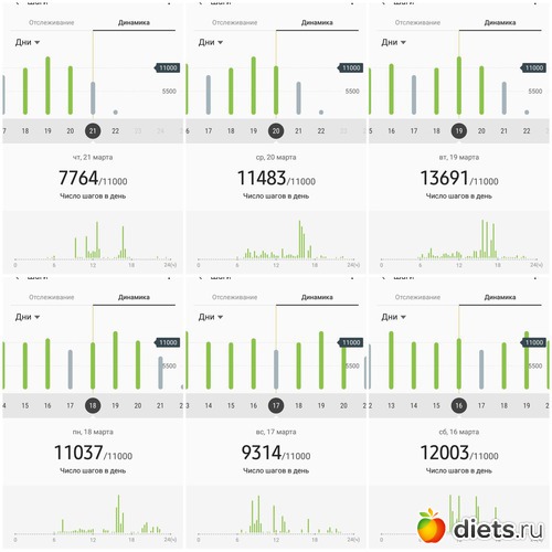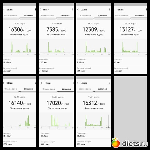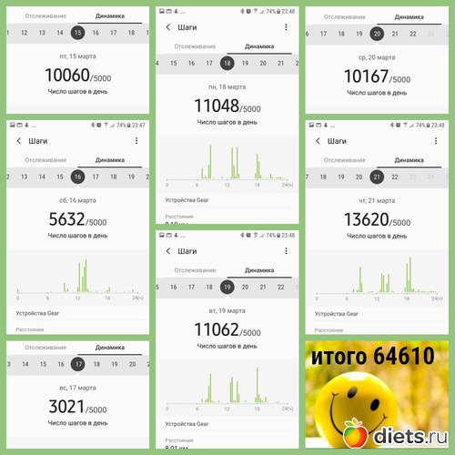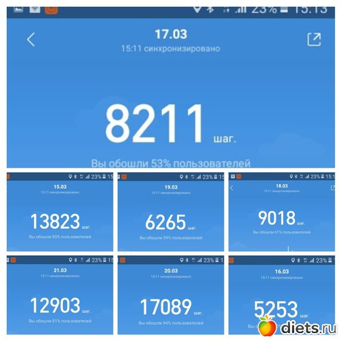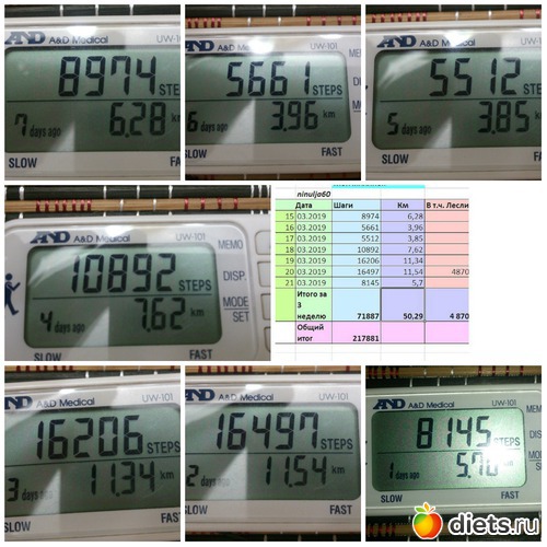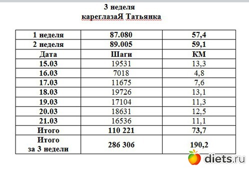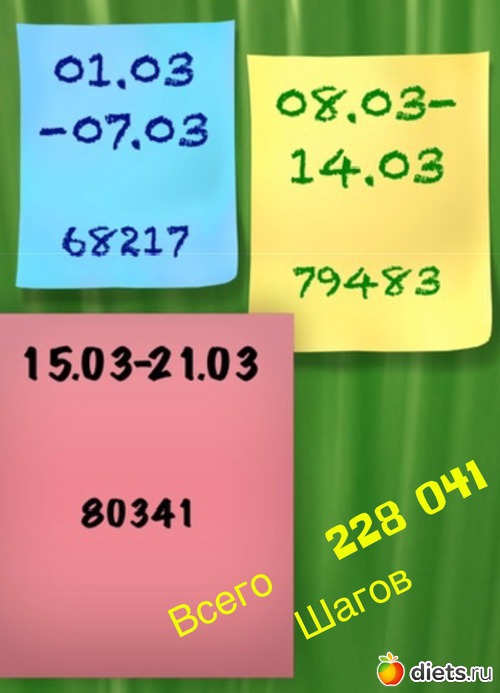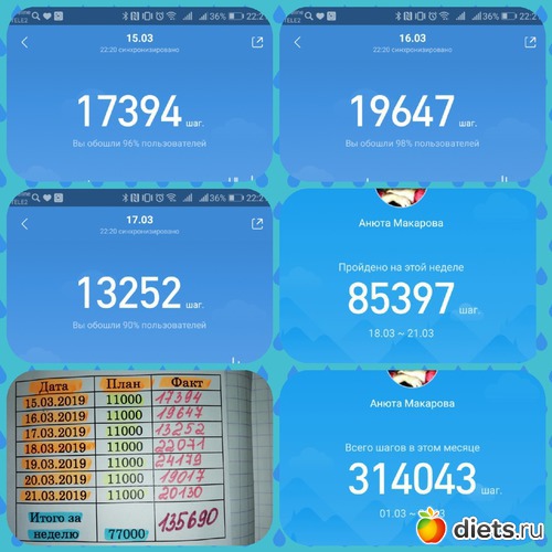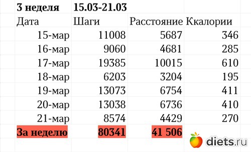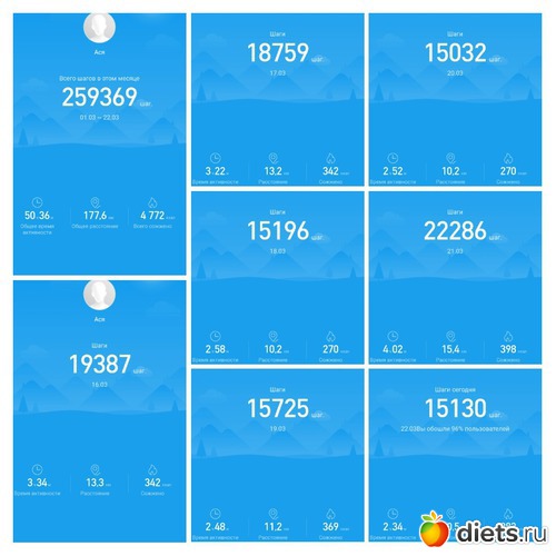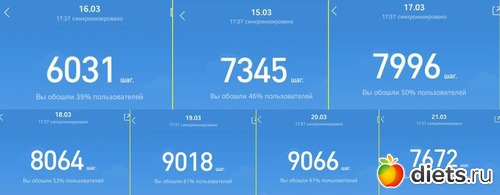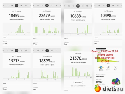 За неделю с 15.03.2019 по 21.03.2019 пройдено 105278 шагов. Всего с 01.03.2019 пройдено 268305 шагов