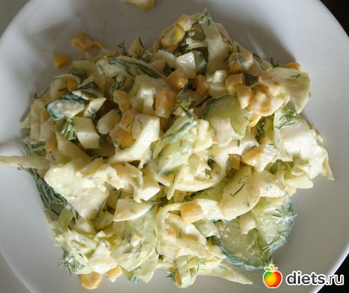 Капуста, вареные яйца, огурец, кукуруза, укроп, греческий йогурт