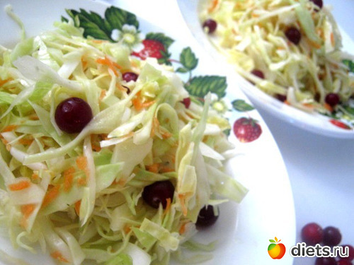 Салат любимый из свежей капусты с морковью, огурцом или клюквой.