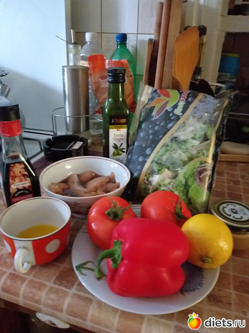 Филе я мариную в соевом соусе на ночь, а после обжариваю (больше даже тушу) на сковороде по времени минут 15 наверное (можно варить, жарить, запекать). После остужаю. Режу соломкой (по возможности ). Режу помидоры и перец. Высыпаю в одну миску с листьями салата.