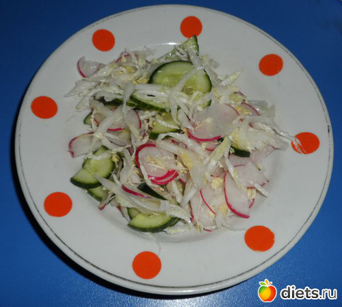 2) салата было три и они повторялись. Черемша+редиска+ сметана, пекинская капуста+редиска+масло подсолнечное, редис на терке+ масло