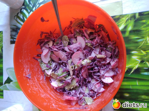 питание купила фиолетовую капусту, делала салат с ней и редиской. Цвет отличный, но больше её покупать не буду, пекинская вкуснее