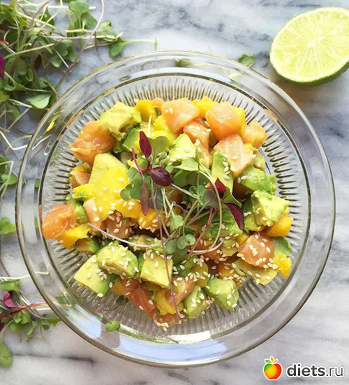 2. Мой самый любимый севиче из рыбы и манго. Красную рыбу: лосось/семга, манго и авокадо, порезать кусочками. Заправка: половинку перца чили порезать тоненькими полосочками, смешать с соком лайма, солью. Заправить. Посыпать кунжутом, можно с зелень добавить. Где-то у меня было фото его, относительно недавно готовила, если найду добавлю.