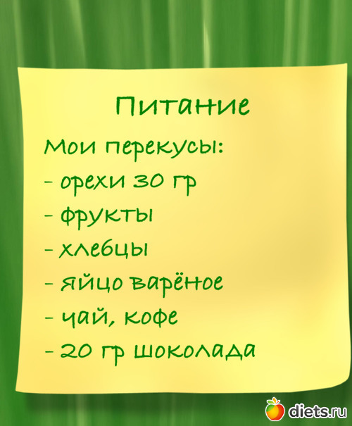 Мои перекусы- это: яблоки, огурцы, отруби с кефиром, сухофрукты ( по 3 штуки, мах 6 штук) чернослив, курага, финики. Раньше зефир был, как перекус, ныне благоразумно исключила. Как только узнала, что одна зефирина 302 ккал, - так всё! Как отрезало!
