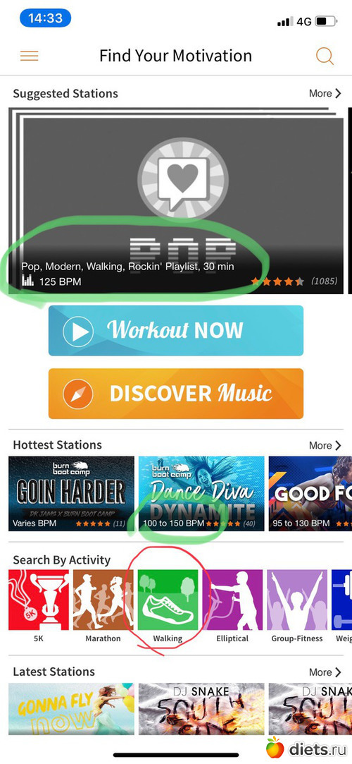 Очень много разный плей-листов !!!! даже выбирая категорию "ходьба" - на выбор 74!!!!!!!! плей-листа на любой вкус и настроение!!!!!!
