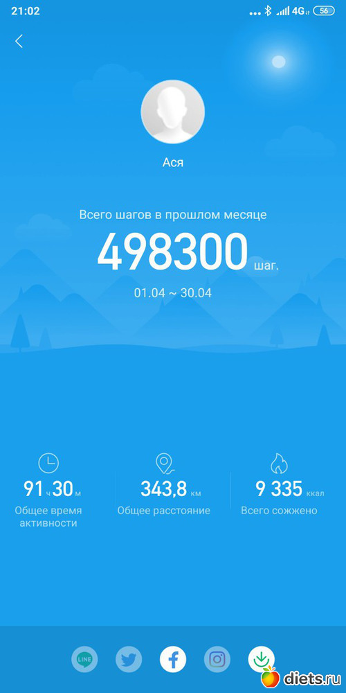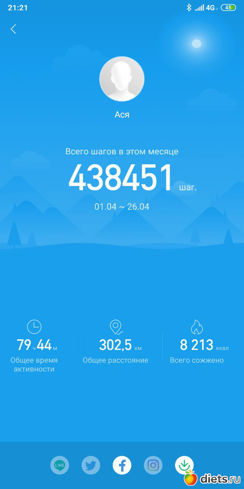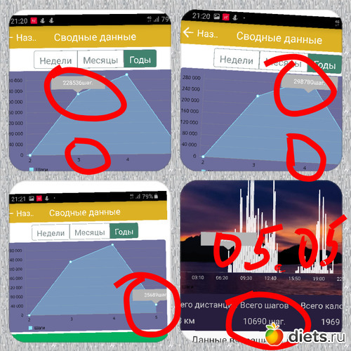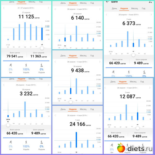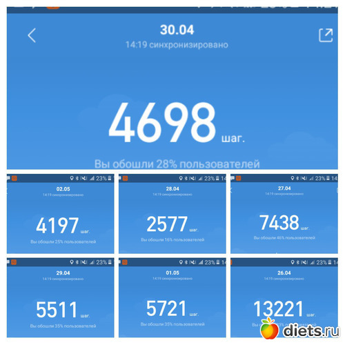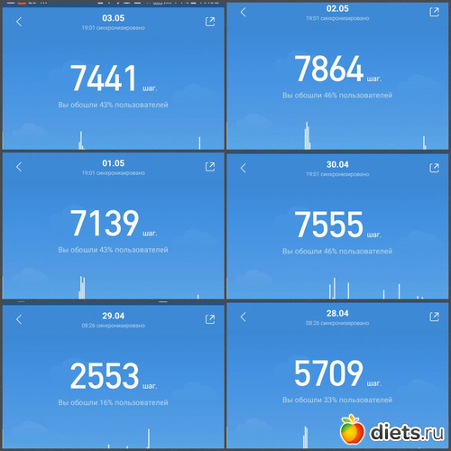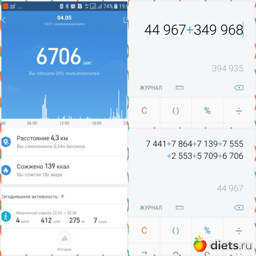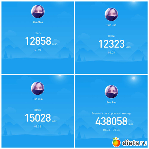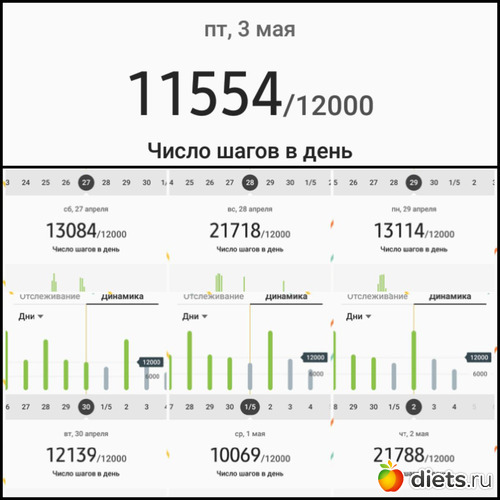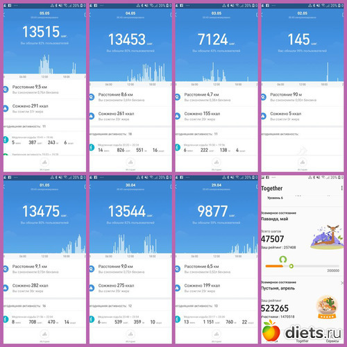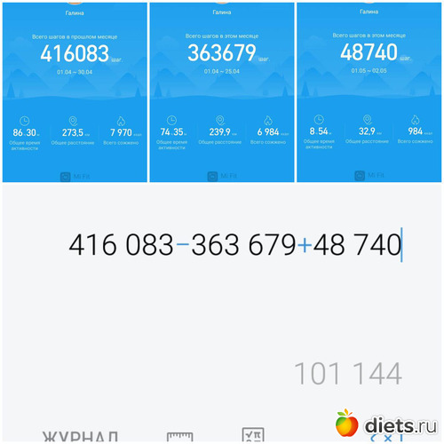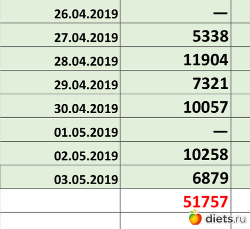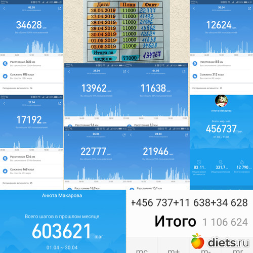 У меня сегодня нехитрые подсчеты, так как одна неделя слетела, но остались общие данные за месяц. Итак, высчитывала шаги за три недели, которые не отчиталась: 228536 (за март)+298780 (за апрель)+35689 (за май с 1 по 4)+10690 (сегодня 05.05) = 573695 шагов всего - 346135 шагов (последние результаты) = 227560 шагов