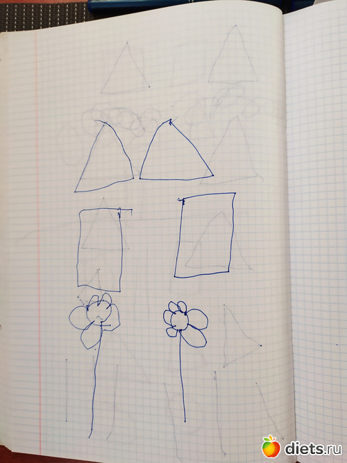 Одновременно двумя руками рисовали. Это ребенка художества. Если учесть,что в обоих руках по ручке да еще и левой никогда не рисовал,то результат