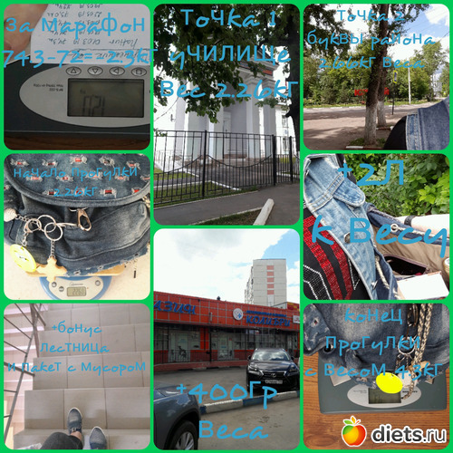 1. Спорт. Гуляю каждый день на работу и обратно с женской сумочкой, в которой чего только нет... весом 3-4 кг, а сбросила за марафон где-то в пределах 4- 5 кг, что очень радует. Будем считать задание выполнено