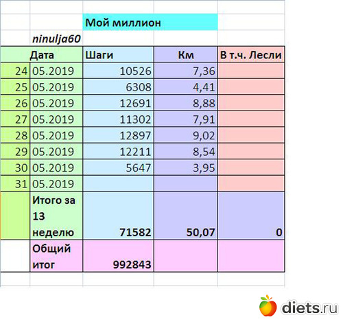 Итак подвожу итог, сегодня много ходить больше не планирую. Благодаря нашему марафону стала ходить в два раза больше, чем раньше. Расстояние в 10 км кажется ерундой, мои близкие тоже заочно приняли участие в нашем миллионе, очень много ходила со мной сестра.