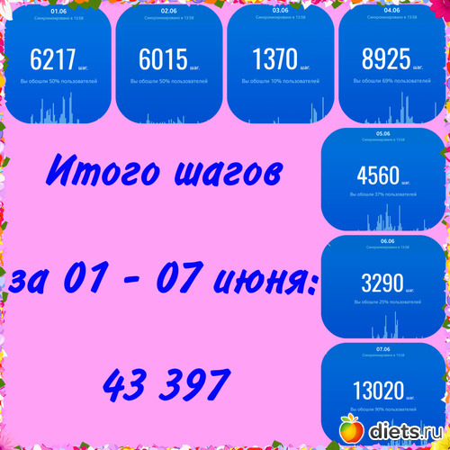 Неделя была "ужасная" - гости, гулянки, за встречу, за отъезд(ну а что вы хотите-туристический сезон, белые ночи...) цели не выполнила вообще! На следующую неделю цель одна, но глобальная:дать себе пинка под зад, И НАЧАТЬ УЖЕ В КОНЦЕ КОНЦОВ, ЧТО, - НИБУДЬ ДЕЛАТЬ!!! хоть калории считать, что ли... Фитнес-выбрать для него время.... Сладкого поменьше.. Ну, в общем, как-то так....