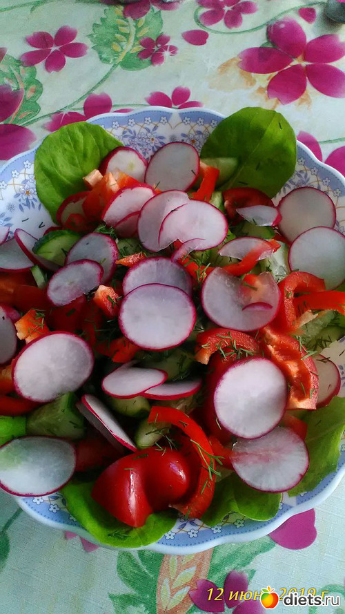 Иногда я готовлю что-то экзотическое, но чаще варю суп на неделю (борщ, солянку или рассольник) и добавляю к этому основному салату то редиску, то помидор и огурец.
