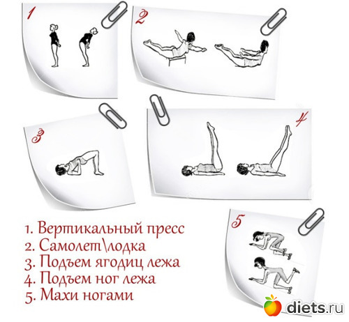 Основной упор сделай на пресс и ягодицы. Действуй следующим образом: чередуй классический пресс с нижним прессом (подъем ног лежа и Алфавит), махи ногами с приседаниями и подъемом ягодиц. Учитывай, что в двух подходах должно быть по 3 повторения нужного упражнения, для достижения максимального результата. В интенсивной тренировке (например, в день, когда упор делается на пресс) повторений должно быть около 5. Для общего тонуса и поддержания хорошей формы достаточно двух повторений по 20–25 раз.