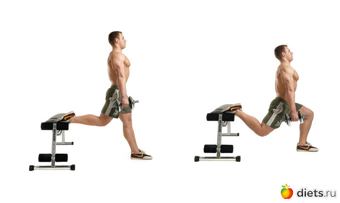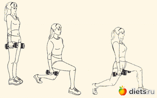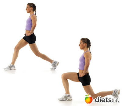 Встаньте ровно, поставьте ступни параллельно друг другу чуть шире бедер. Спину слегка прогните в пояснице, колени чуть согните. Сделайте широкий шаг вперед, удерживая туловище в ровном положении, при этом центр тяжести должен быть на выставленной вперед ноге. Присядьте на переднюю ногу. Угол между бедром и голенью должен быть прямым, согнутое колено – на уровне стопы (оно должно «висеть» в нескольких сантиметрах над полом, но не касаться его). Поднимитесь из приседа и отшагните назад передней ногой в исходное положение. Повторите упражнение на другую ногу.