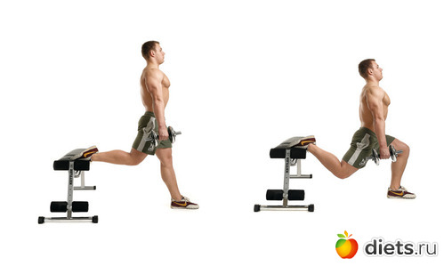 Техника выполнения данных выпадов практически такая же, как при стандартном упражнении. Но здесь используется скамья. Необходимо встать к ней спиной и положить на нее нижнюю часть голени задней ноги, и начинаем приседать как при традиционных выпадах.