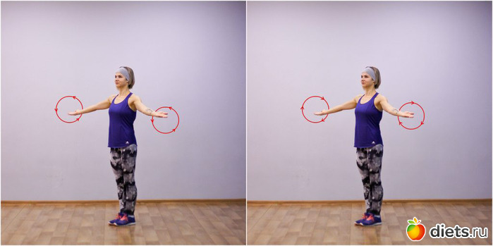 Медленно описывайте руками небольшие круги диаметром около 15 сантиметров. В основном движение исходит от плеч, напряжение чувствуется в их задней части.