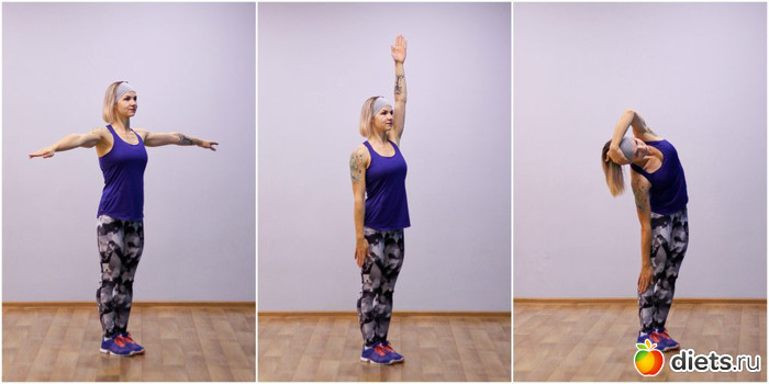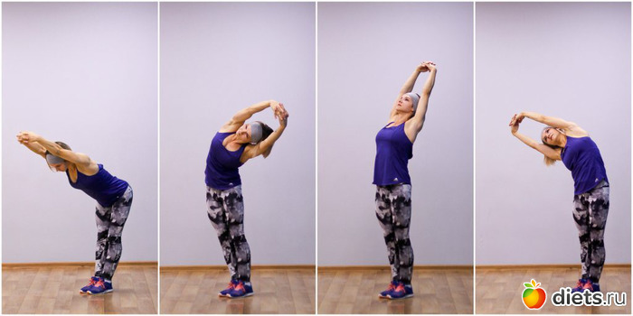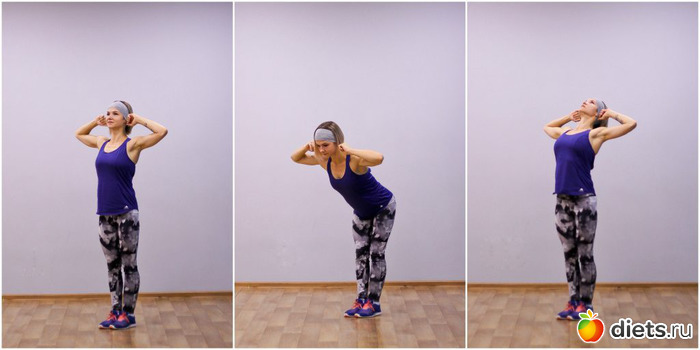 Упражнение 2. Наклоны с руками за головойРастягивает мышцы живота, укрепляет спину, улучшает осанку.
