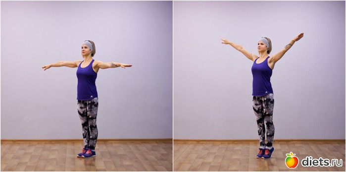 Встаньте прямо, ноги на ширине плеч, руки поднимите в стороны на уровень плеч, разверните вниз ладонями.