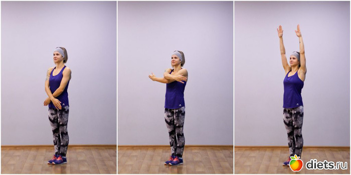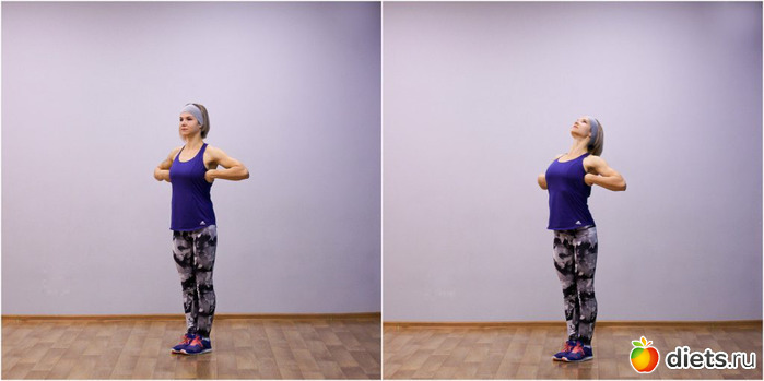 Встаньте прямо, руки поднимите над головой и сплетите пальцы в замок, повернув ладони к голове. Чем ближе руки к голове, тем эффективнее упражнение.